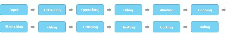 Vật liệu cơ bản, ở dạng vụn, được nung chảy trong máy đùn trước khi được định lượng trong bơm bánh răng và chuyển đến vòi phun. Các polyme đi qua vòi phun được làm nguội và đông đặc trong bể kéo sợi, và cuối cùng tạo thành dạng sợi (bán thành phẩm). Sợi được tạo ra từ nhiều bể kéo sợi được bôi trơn và tập hợp trước khi được quấn bằng bánh răng và được đóng vào lon. Sợi được đóng vào lon sẽ được tạo ra nhiều đặc tính khác nhau thông qua quá trình kéo giãn, trong đó sợi được kéo giãn ở nhiều tốc độ trục lăn khác nhau được thiết kế để đạt được các mức độ cứng và đàn hồi khác nhau.